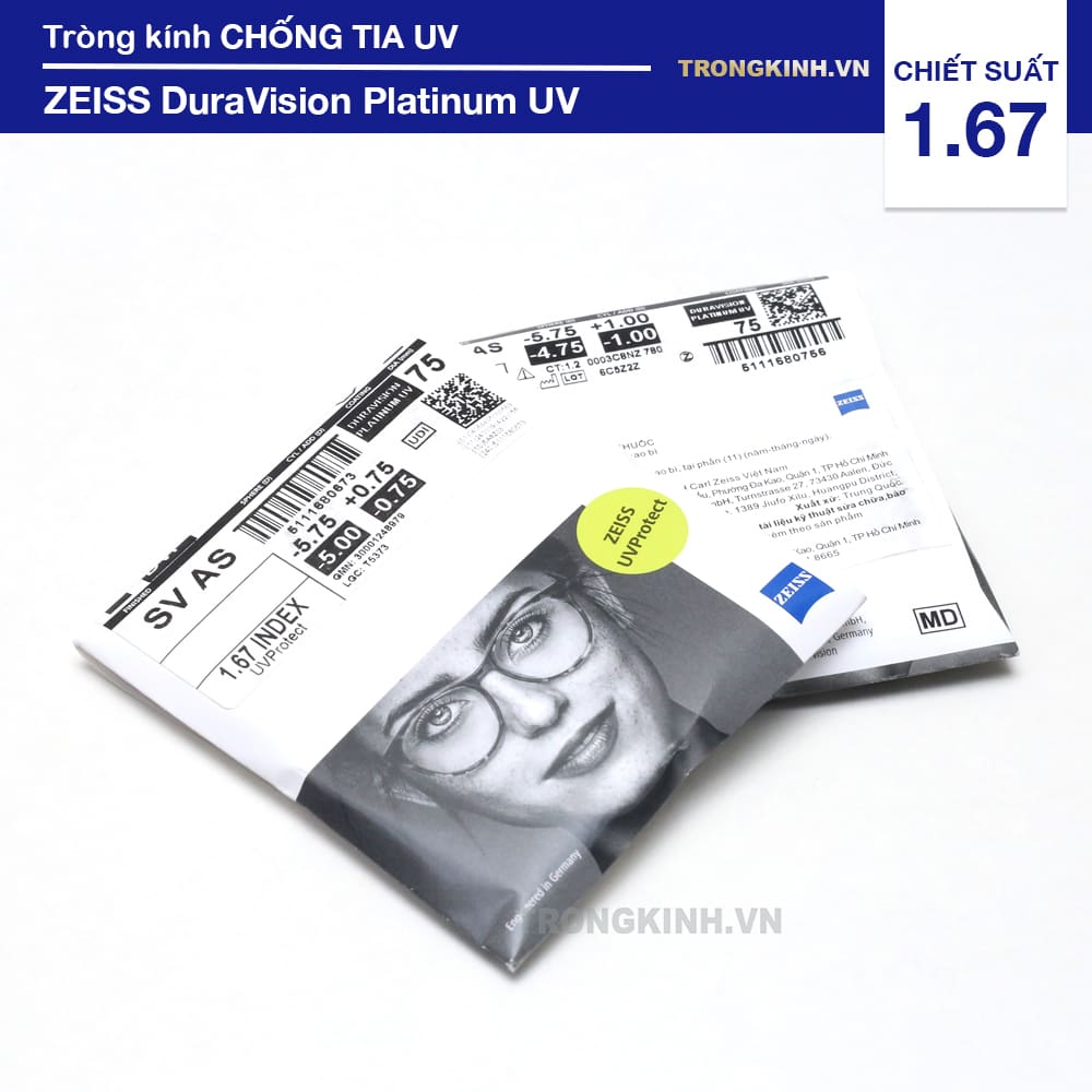 Nếu bạn cần tròng kính siêu mỏng chống chói, chống tia UV thì nên chọn tròng kính Zeiss DuraVision Platinum UV 1.67, một sản phẩm nổi tiếng bán chạy đến từ Đức